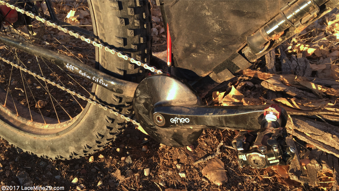 The offset Pugsley chassis was designed way back when for 26 x 3.8″ tires, but Surly being Surly they gave it massive clearance and that forethought has kept the Pugsley relevant all these years. I offset laced a Bontrager Jackalope B Fat rim to my all-time-favorite DT 350 rear hub, then inflated a Bontrager Hodag 27.5 x 3.8″ tire on it. I was verily shaking when I installed this combo in both frame and fork, so excited was I at the prospect of it fitting. Even slammed all the way forward in the dropouts there is plenty of clearance in both frame and fork.