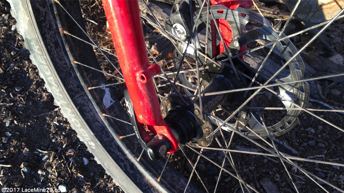 Currently I’ve got a Surly SS hub up front — mostly because it was cheap and I didn’t have an immediate need to spend a lot more money. I will likely replace it with a DT 350 to match the rear, with a redundant (or close enough) gear.