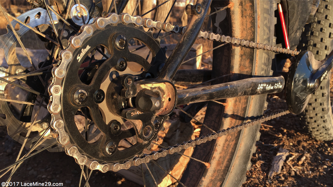 Thus far I’ve experimented with 28, 32, and 34t cogs. For flatter trips the 28t would be fine. My first trip out had a fair bit of climbing, and the 28t was too tall given the grades and loads. Switching to the 34t gave me gearing to climb for days, but with the tradeoff of not being able to wind it out when the grade mellowed and/or the surface firmed. Thus far 32t seems like a good compromise, though I may yet experiment with a 30t as well.
